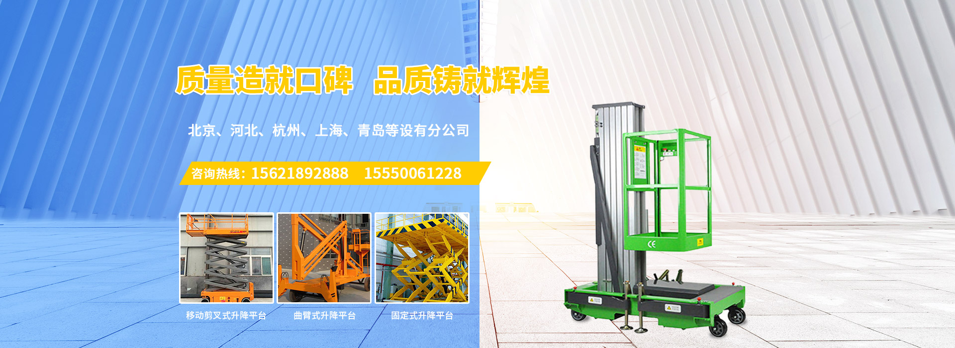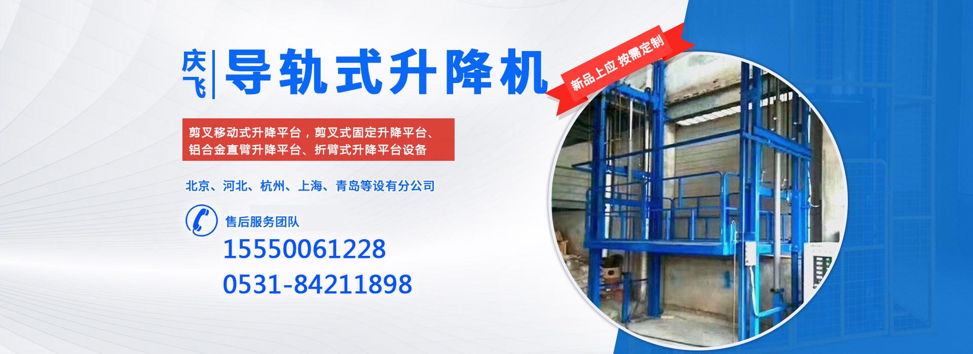 濟(jì)南慶飛機(jī)械設(shè)備有限公司目前專(zhuān)心致力于液壓升降平臺(tái)領(lǐng)域。公司主要產(chǎn)品有:剪叉移動(dòng)式升降平臺(tái),剪叉式固定升降平臺(tái)、鋁合金直臂升降平臺(tái)、折臂式升降平臺(tái)、曲臂式升降平臺(tái)、車(chē)載式升降平臺(tái)、牽引式升降平臺(tái)、自動(dòng)行走式升降平臺(tái)、移動(dòng)式固定式登車(chē)橋、桅柱式鋁合金升降平臺(tái)、鋁合金升降舞臺(tái)、固定軌道臺(tái)面旋轉(zhuǎn)式升降平臺(tái)等,產(chǎn)品廣泛適用于電力、通訊、路燈、交通、交警、建筑裝簧、園林、廣告、高速公路、大型廠(chǎng)礦企業(yè)等領(lǐng)域,還可根據(jù)用戶(hù)的需求設(shè)計(jì)制造包括特殊尺寸、承載能力、防爆電器的液壓升降臺(tái)。